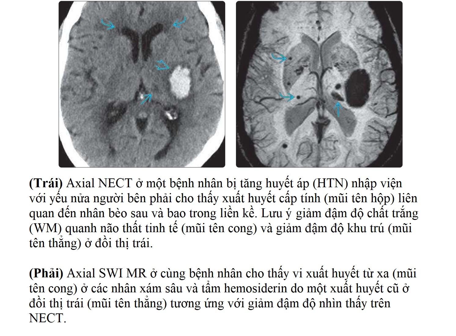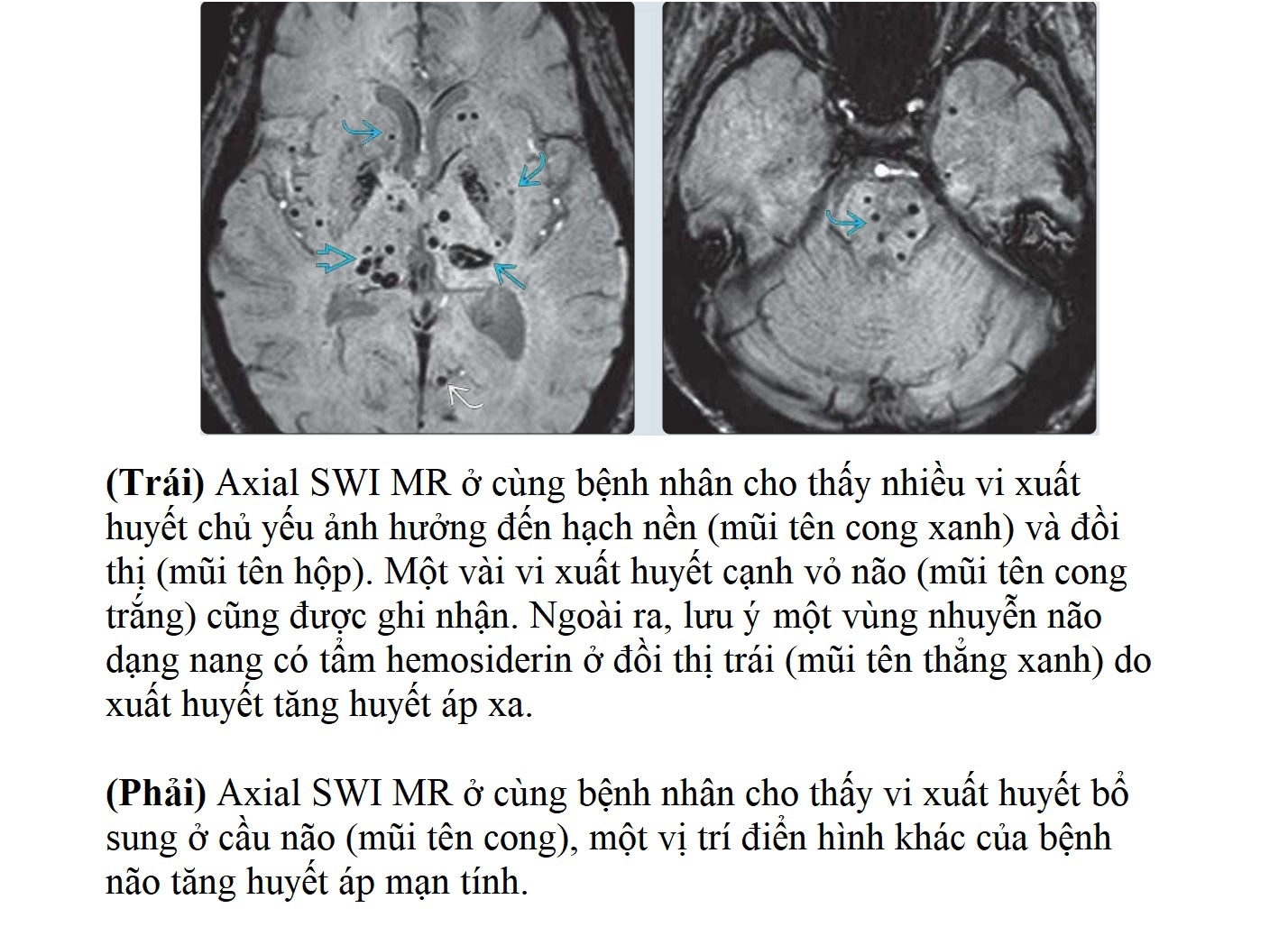 - Phân biệt: vị trí ưu thế của xuất huyết và vi xuất huyết (CAA: thùy não ngoại vi; CHE: nhân xám sâu, thân não, tiểu não). CAA thường gặp ở người lớn tuổi không nhất thiết có tiền sử tăng huyết áp nặng.