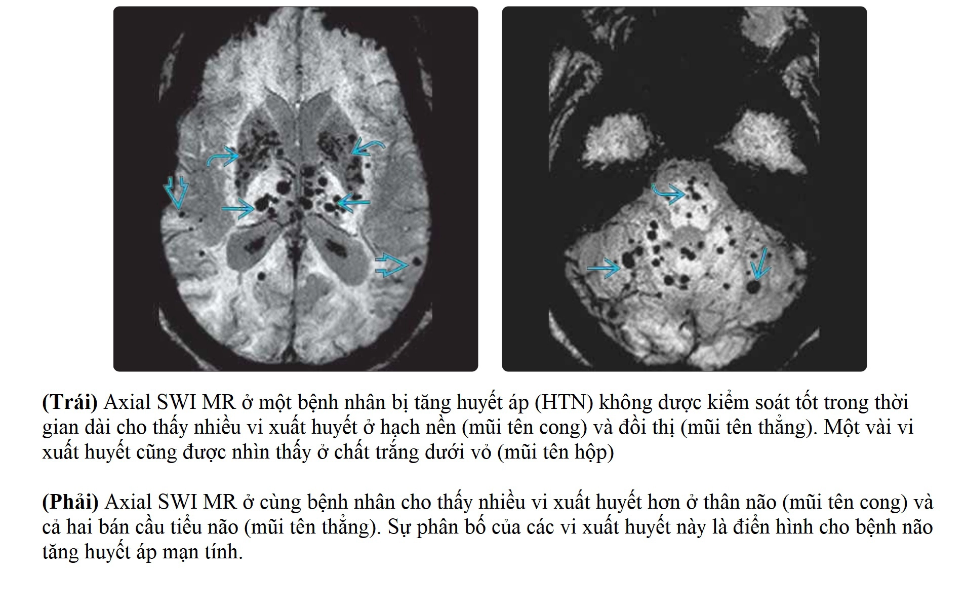 - MRI là phương tiện hình ảnh học nhạy hơn CT trong việc phát hiện các tổn thương chất trắng và vi xuất huyết.