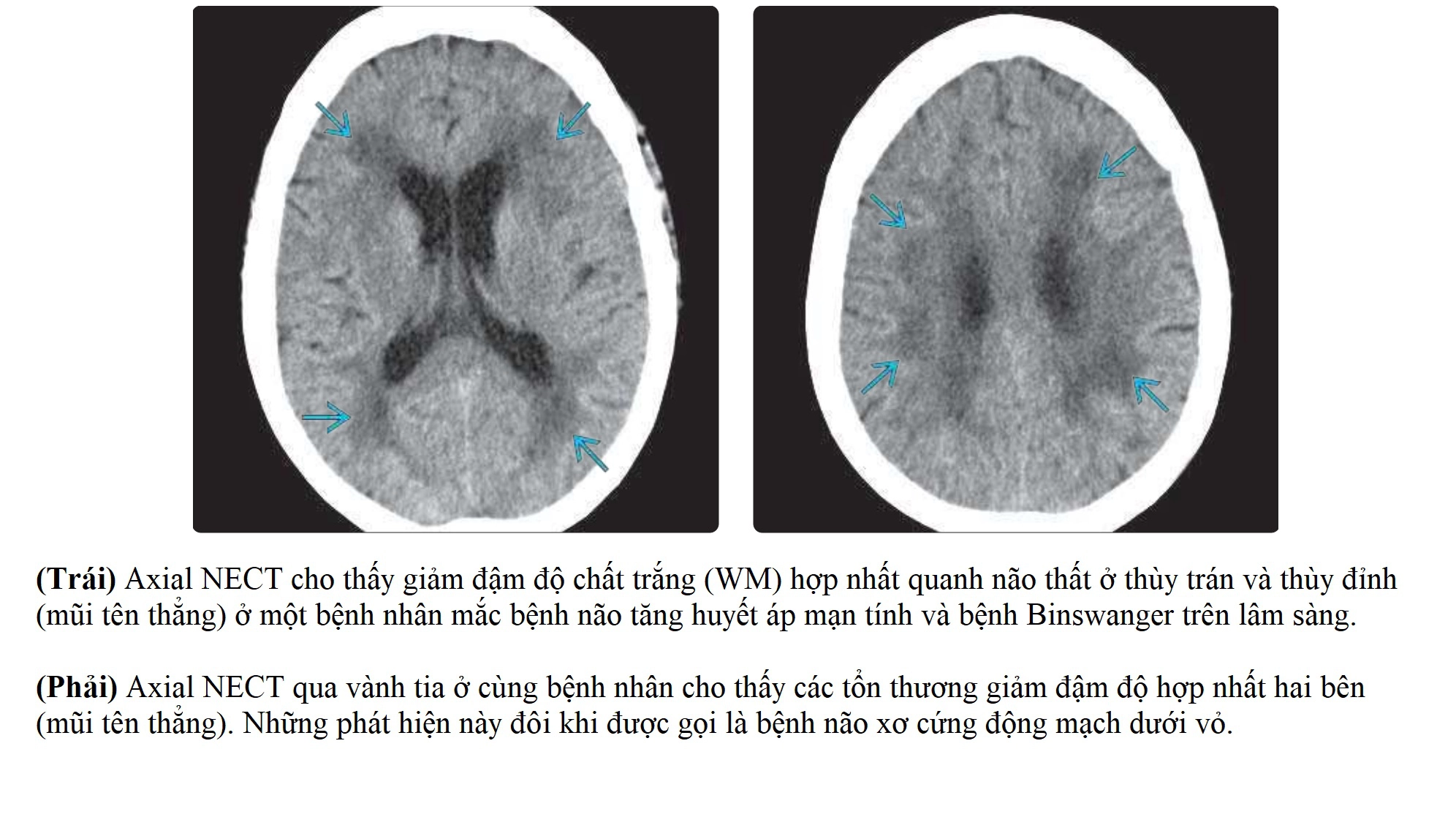 - Giảm tỷ trọng lan tỏa ở chất trắng quanh não thất và chất trắng sâu (leukoaraiosis).